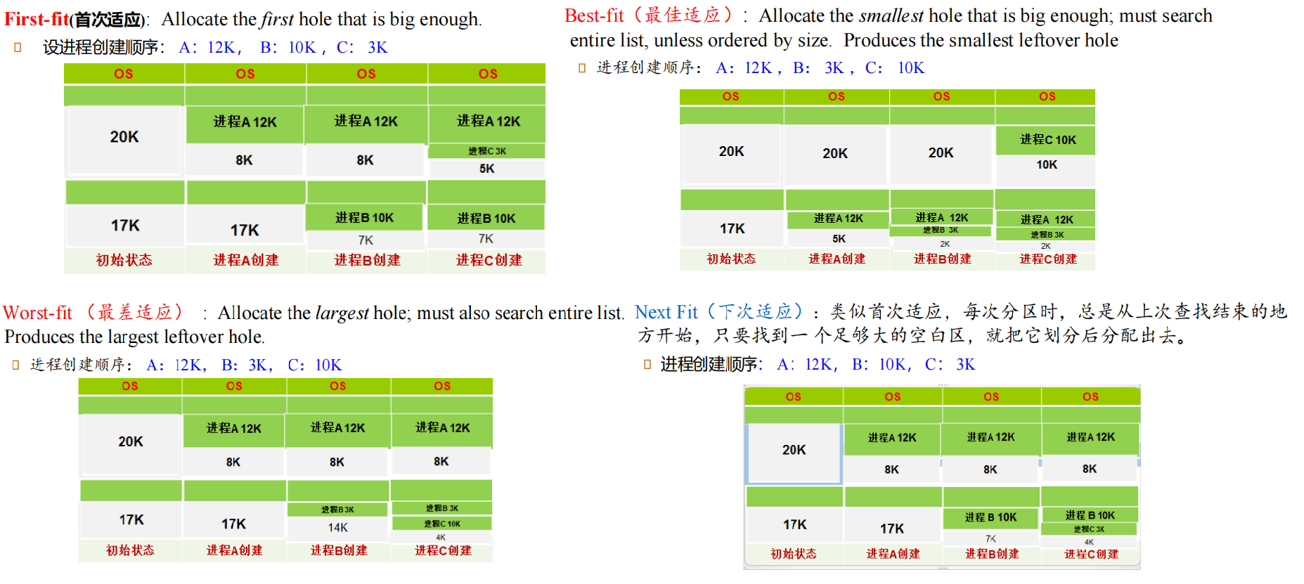 - Next-Fit: 类似首次适应,每次分区时,总是从上次查找结束的地方开始,只要找到一 个足够大的空白区,就把它划分后分配出去。