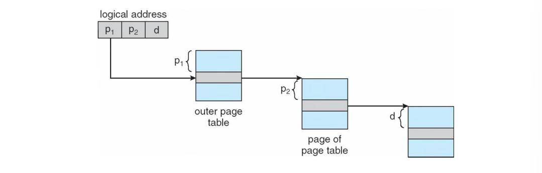 以两级页表为例,在32位机器上,若页大小为 4 KB(即 \(2^{12}\) 字节),则逻辑地址由 32 位组成,其中低 12 位为页内偏移(page offset),用于定位页内的具体位置;高 20 位为页号(page number),用于索引页表。由于页表本身可能很大,无法放入一个页框中,因此采用两级分页机制:将 20 位的页号进一步划分为两个 10 位的部分——\(p_1\) 和 \(p_2\)。其中,\(p_1\) 作为索引访问外层页表(outer page table),查得对应页框的基址;\(p_2\) 则作为偏移量,用于在该页框中查找目标页的物理帧号。