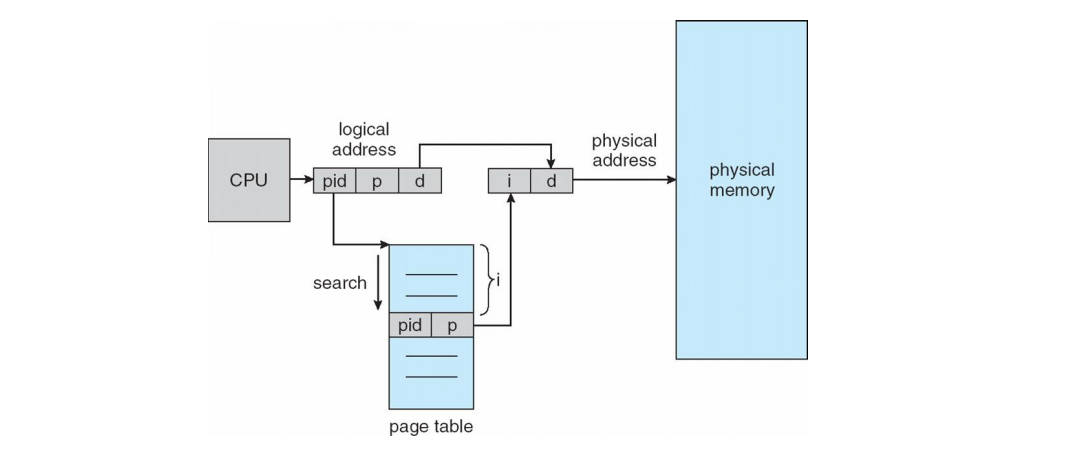 当CPU生成一个逻辑地址时,系统将其拆分为进程标识符(pid)、虚拟页号(p)和页内偏移(d);随后,以(pid, p)作为关键字在反向页表中进行查找——通常借助哈希函数快速定位到可能的表项链表,并在其中逐项比对是否匹配;若找到对应项,则从中提取出该页所在的物理帧号(i),结合页内偏移(d)构成完整的物理地址并访问内存;若未找到,则说明该页当前不在物理内存中,触发缺页中断,由操作系统从外存调入后再更新反向页表。