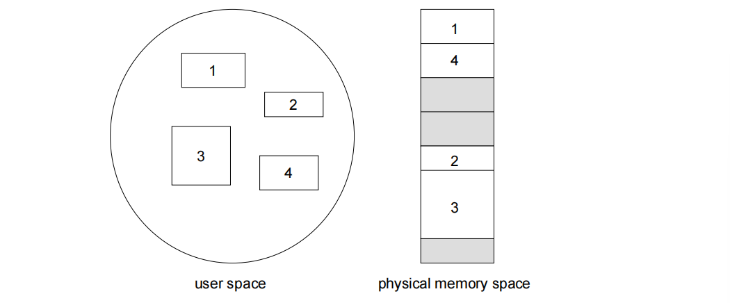 为减少外部碎片化,可通过紧缩(compaction)或拼接(defragmentation)技术将内存中的进程重新排列,使所有空闲内存块合并成一个连续的大块,从而提高内存利用率并支持更大进程的加载。紧缩过程涉及大量数据移动,开销较大,因此属于昂贵的操作,通常只在必要时执行。
