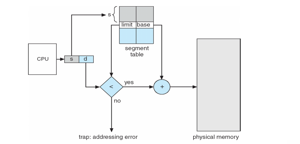 <s=3, d=200>表示访问第3号段中的第200字节。系统首先通过段表基址寄存器(STBR)定位段表起始地址,并以段号 s 为索引查找对应的段表项,从中获取该段的基址(base)和长度限制(limit)。随后进行合法性检查:若偏移量 d 小于 limit,则视为合法访问;否则触发“地址错误”异常,防止越界访问。若检查通过,物理地址即为base + d,该地址被发送至主存控制器,完成实际的数据读取或写入操作。