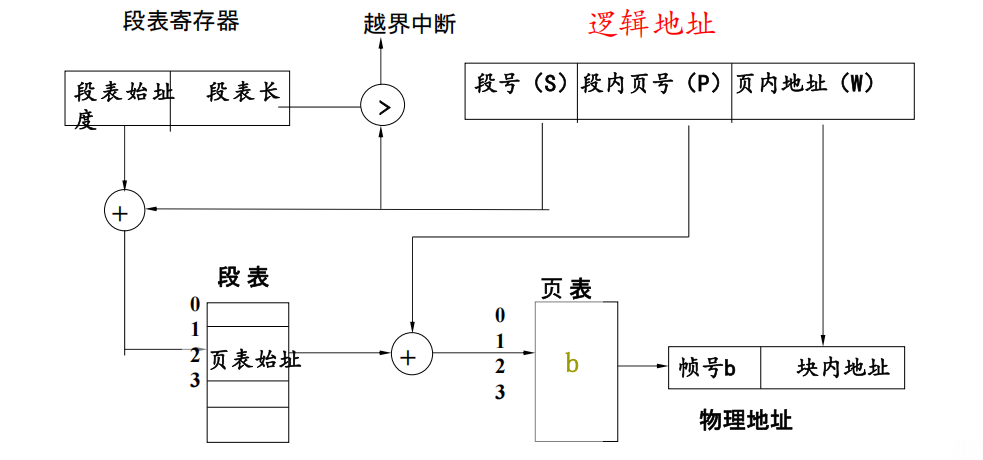 段表的起始位置由段表基址寄存器(STBR) 指向,而段表长度寄存器(STLR) 则记录当前进程使用的段数,用于验证段号合法性——只有当段号 s<STLR 时,该段才被视为合法,从而防止越界访问。