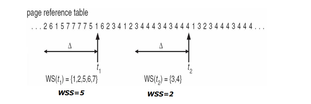 \(WSS_i\):进程 \(P_i\) 的工作集大小 = 最近 Δ 时间内引用的不同页面总数(随时间变化)