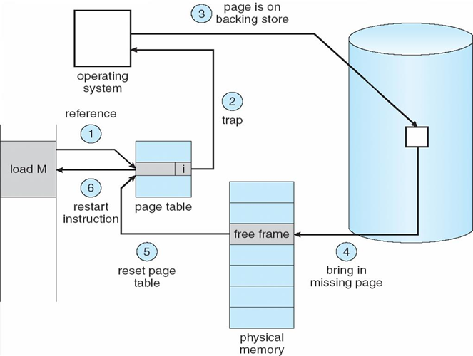 当 CPU 访问某个虚拟地址时,若对应页表项的有效位为 i,则触发缺页中断(page fault)。操作系统随后执行以下缺页处理步骤: