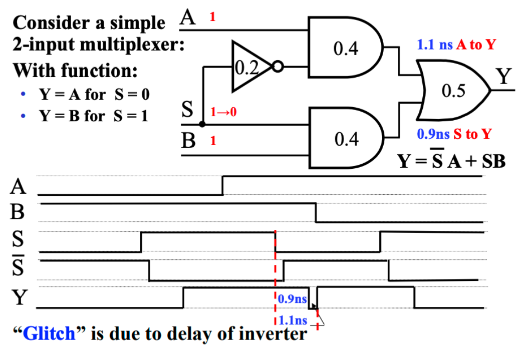 例如,从数学角度看,\(\mathrm{Y=\overline{A}A}\) 的值恒为 0,但是实际上由于延迟,其仿真波形中会出现这样一个 毛刺(glitch),而这在工程意义上有很大的问题。
