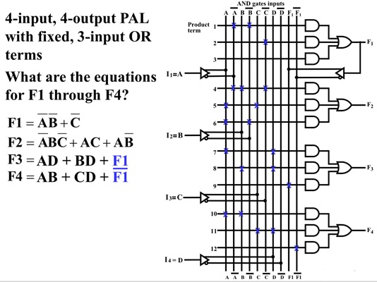 基本构成:可编程的AND与OR项,以及最后的异或项(本质是增加最小项)