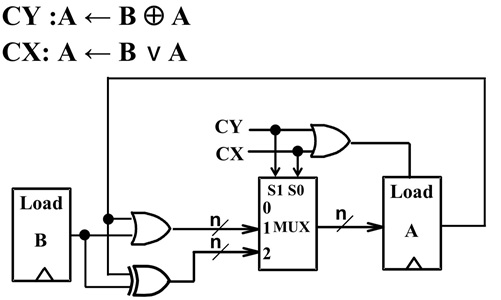 Register transfers: \(CY:A\leftarrow B\bigoplus A\) $CX:A\leftarrow B\vee A $ \(Hold state:(0,0)\)