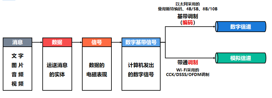 从原始消息到最终在信道中传输的信号形式的整个过程,经历了下图的操作