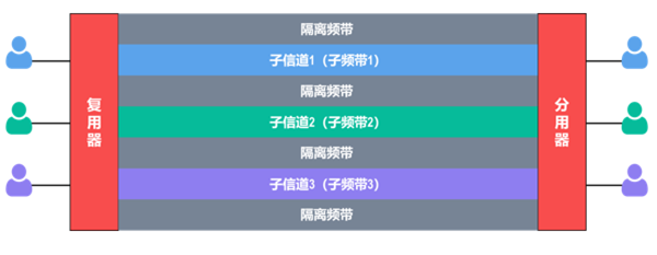 - 频分复用FDM:频分复用的所有用户同时占用不同的频带资源并行通信