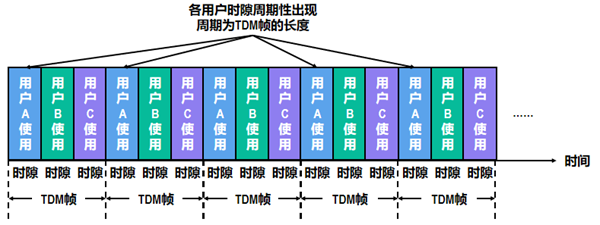 - 时分复用TDM: 时分复用的所有用户在不同的时间占用同样的频带