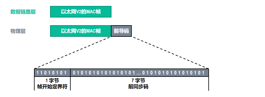 接收方的数据链路层如何从物理层交付上来的比特流中提取出一个个的帧呢?在 PPP 帧的首部和尾部有帧定界标志来进行标识,但是有一些帧首部和尾部并不包含帧定界标志,比如说以太网 V2 的 MAC 帧,它是使用前导码来进行标识的