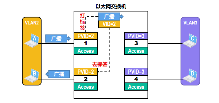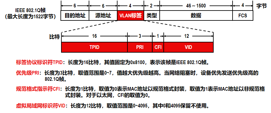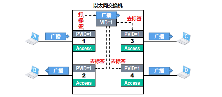 - 当交换机收到普通的以太网MAC帧时,会给其插入4字节的VLAN标签使之成为802.1Q帧,该处理简称为“打标签”。