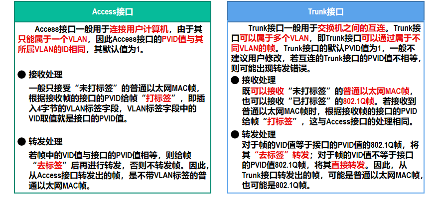 根据接口在接收帧和发送帧时对帧的处理方式的不同,以及接口连接对象的不同,以太网交换机的接口类型一般分为Access和Trunk两种。