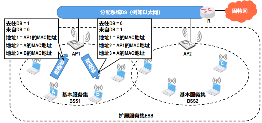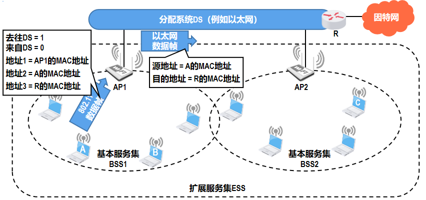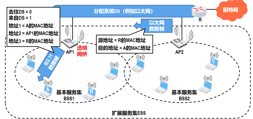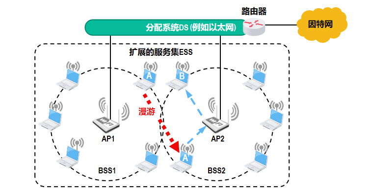 由多个基本服务集(BSS)通过分配系统(DS,如以太网)连接组成扩展的服务集(ESS)。每个BSS由一个接入点(AP)和与其关联的移动站(如笔记本电脑、手机)构成,AP负责管理无线通信并连接到有线网络。多个BSS通过分配系统互联形成ESS,实现更大范围的覆盖。当用户设备(如图中设备A)从一个BSS(如BSS1)移动到另一个BSS(如BSS2)时,可通过漫游机制无缝切换接入点,保持网络连接。整个ESS通过路由器与因特网相连,为用户提供连续的无线接入服务。