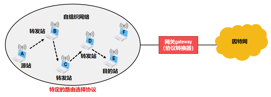 在这种网络中,所有站点(如A、B、C、D、E、F)均为对等节点,无需依赖接入点(AP),通过多跳转发的方式直接相互通信。数据从源站(如A)发送到目的站(如E)时,可能需要经过中间站点(如B、C、D)进行转发,网络采用特定的路由选择协议来动态建立通信路径。这种网络结构灵活、部署方便,具有良好的生存性和抗毁性,因此在军用和民用领域都具有广泛的应用前景。当需要连接外部网络时,可通过网关(gateway)实现协议转换,接入因特网。