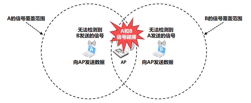 当两个站点A和B同时向同一个接入点(AP)发送数据时,由于它们之间的信号覆盖范围不重叠,彼此无法检测到对方的传输信号,因此在各自看来信道是空闲的。然而,它们发送的数据会同时到达AP,造成信号碰撞,导致通信失败。在这种情况下,A和B互为“隐蔽站”——即彼此不可见但可能引起冲突。