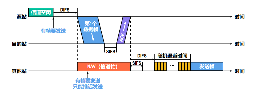 当一个站点需要发送数据时,首先侦听信道是否空闲。如果信道忙(即检测到有其他信号正在传输),则启动退避计时器,等待信道空闲;如果信道空闲,则进一步等待一个短帧间间隔(DIFS, Distributed Inter-Frame Space),以确保高优先级帧(如 ACK)优先发送。