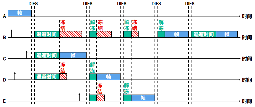 - 当退避计时器的时间还未减小到零时而信道又转变为忙状态,这时就冻结退避计时器的数值,重新等待信道变为空闲,再经过帧间间隔DIFS后,继续启动退避计时器。