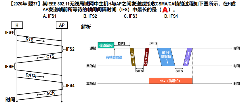 发送方先发送一个短的 RTS(Request to Send)帧,它包括源地址、目的地址和本次通信(包括目的站发回确认帧所需的时间)所需的持续时间。若RTS帧发生碰撞,源站就不可能收到CTS帧,源站会执行退避算法重传RTS帧。