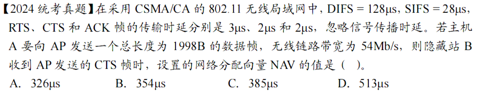 在数据帧的首部中 “持续时间” 字段的值指出了源站要占用信道的时间(包括目的站发回确认帧所需的时间),当某个站检测到正在信道中传送的帧首部中的“持续时间”字段时,就调整自己的网络分配向量(Network Allocation Vector,NAV)。NAV指出了完成这次帧的传送且信道转入空闲状态所需的时间。
