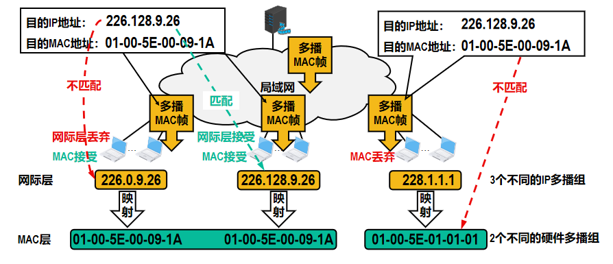 主机配置多播地址:主机 A 首先在本地配置或请求加入该多播组的 IP 地址(如 226.0.9.26)。系统根据映射规则自动生成对应的局域网多播 MAC 地址(如 01-00-5E-00-09-1A),并通知网卡监听该 MAC 地址。