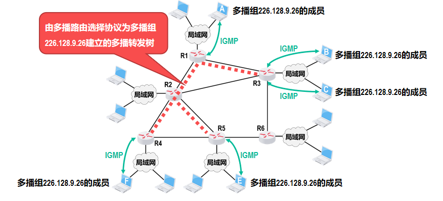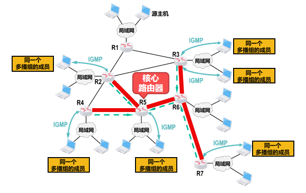 - 利用剪枝(Pruning)算法,剪除广播转发树中的下游非成员路由器,获得一个多播转发树。