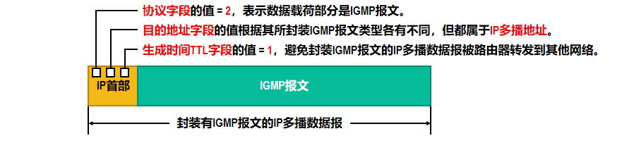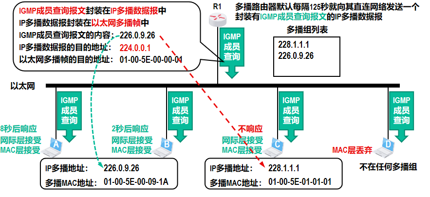 多播路由器通过 IGMP 成员查询报文 来监视本地网络中多播组成员的变化。默认情况下,路由器每隔 125 秒向其直连网络发送一个 IGMP 成员查询报文,该报文封装在 IP 多播数据报中(目的 IP 地址为 224.0.0.1),再封装到以太网帧中,目的 MAC 地址为 01-00-5E-00-00-01。