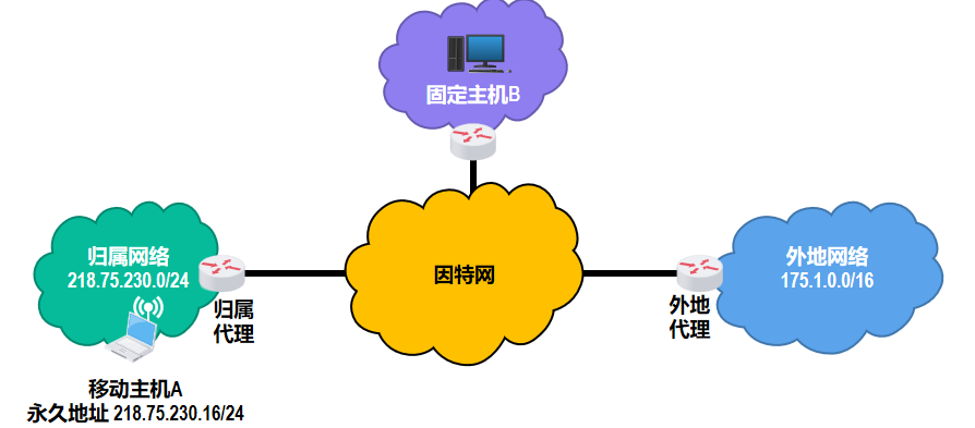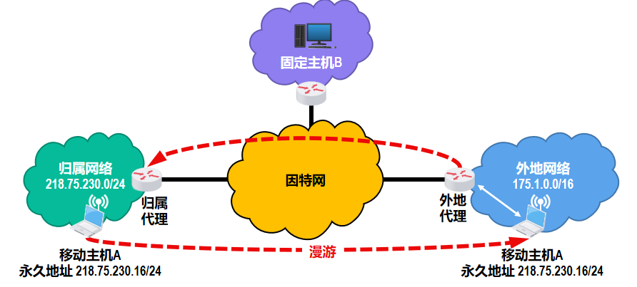 - 移动主机当前漫游所在的网络称为外地网络(Foreign Network)或被访网络(Visited Network)。