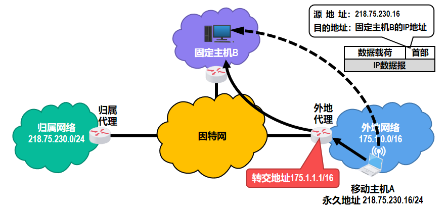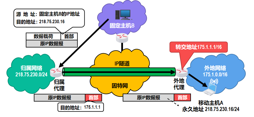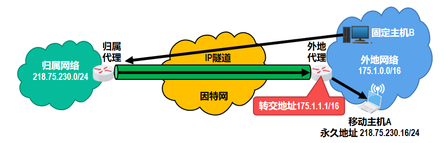 注意当外地代理和移动主机不是同一台设备时,转交地址实际上是外地代理的地址而不是移动主机的地址,转交地址既不会作为移动主机发送IP数据报的源地址,也不会作为移动主机所接收的IP数据报的目的地址。转交地址仅仅是归属代理到外地代理的IP隧道的出口地址。