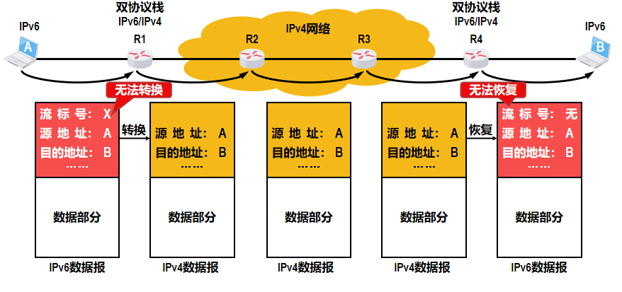 要使双协议栈路由器R4知道IPv4数据报的数据载荷是IPv6数据报,则IPv4数据报首部中协议字段的值必须设置为41。