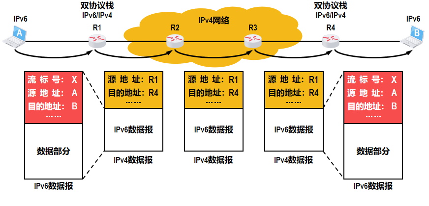 封装有IPv6数据报的IPv4数据报在IPv4网络中传输。当IPv4数据报要离开IPv4网络时,再将其数据载荷(即原来的IPv6数据报)取出并转发到IPv6网络。