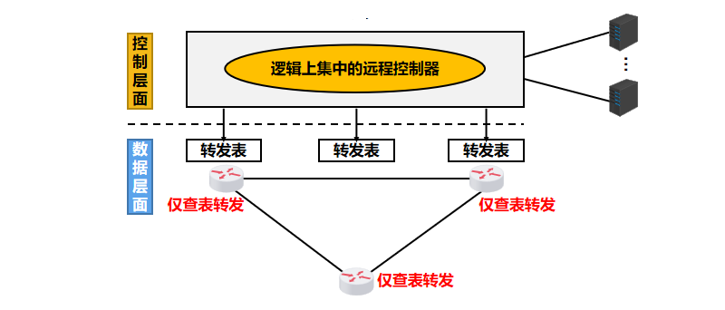 在控制层面中,有一个在逻辑上集中的远程控制器。逻辑上集中的远程控制器在物理上可由不同地点的多个服务器组成。