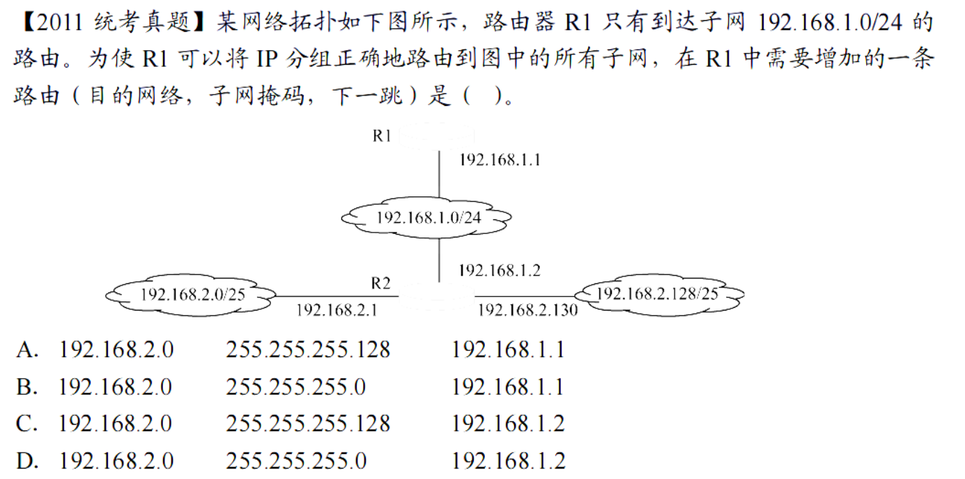 D,192.168.2.0/25 和 192.168.2.128 构成超网 192.168.2.0/24 下一条是 192.168.1.2