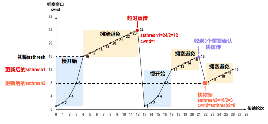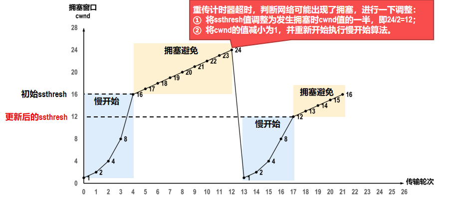 发送方将慢开始门限ssthresh的值和拥塞窗口cwnd的值都调整为当前cwnd值的一半,并开始执行拥塞避免算法。