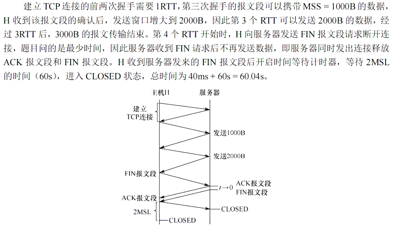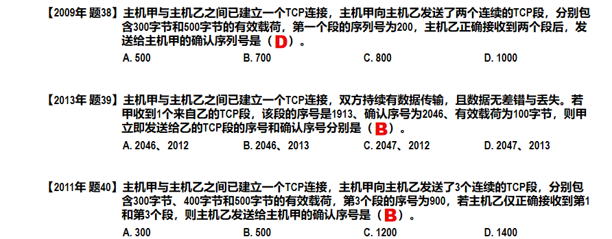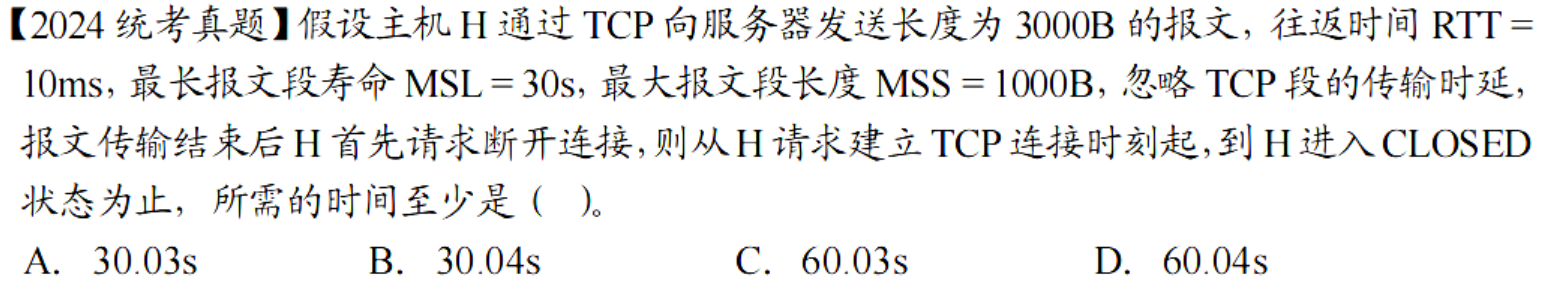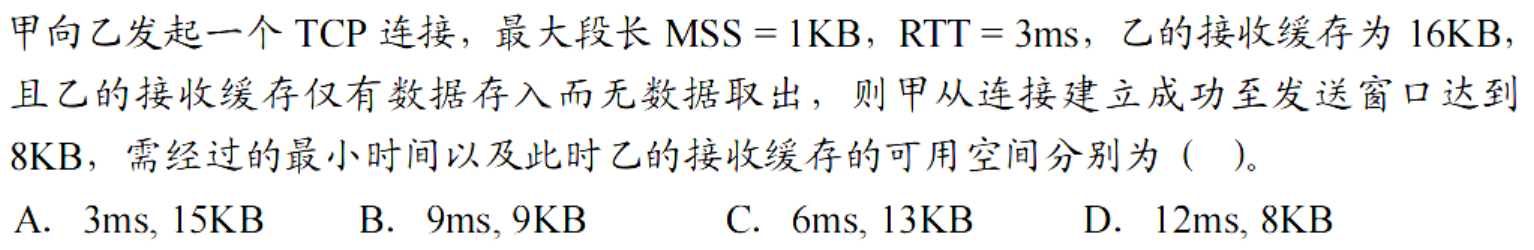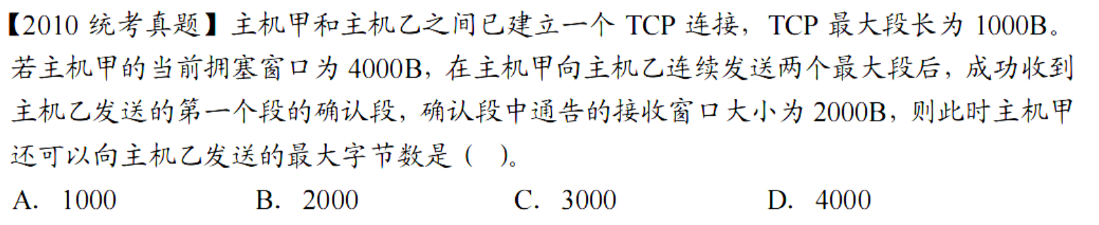 D,这里的易错点就在于误认为 3000B 可以一次性发出,没有真正理解拥塞窗口。这里第一次只能发送 1000B,因为拥塞窗口为1000B,只有它得到确认之后,才能继续往下发,然后我们发现拥塞窗口扩大了,剩下的报文才能被一次性发掉。