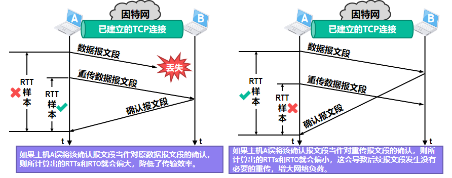 通过上述两个例子可以看出:当发送方出现超时重传后,收到确认报文段时是无法判断出该确认到底是对原数据报文段的确认还是对重传数据报文段的确认,也就是无法准确测量出RTT,进而无法正确计算RTO。