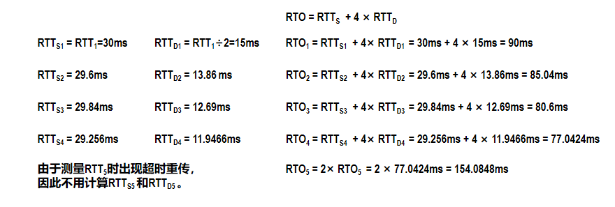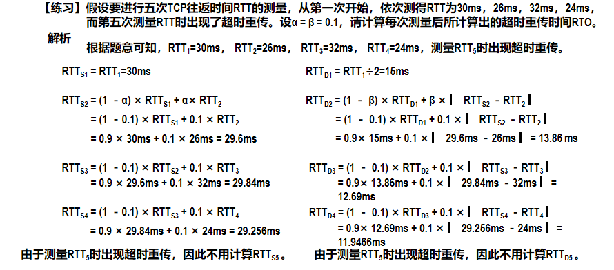 TCP在选择超时重传时间(RTO)时,不能直接使用某次测量得到的往返时间(RTT)样本值,因为单个样本可能受网络波动影响而不稳定。为此,TCP采用加权平均的方法计算平滑的往返时间(RTTs),公式为:
