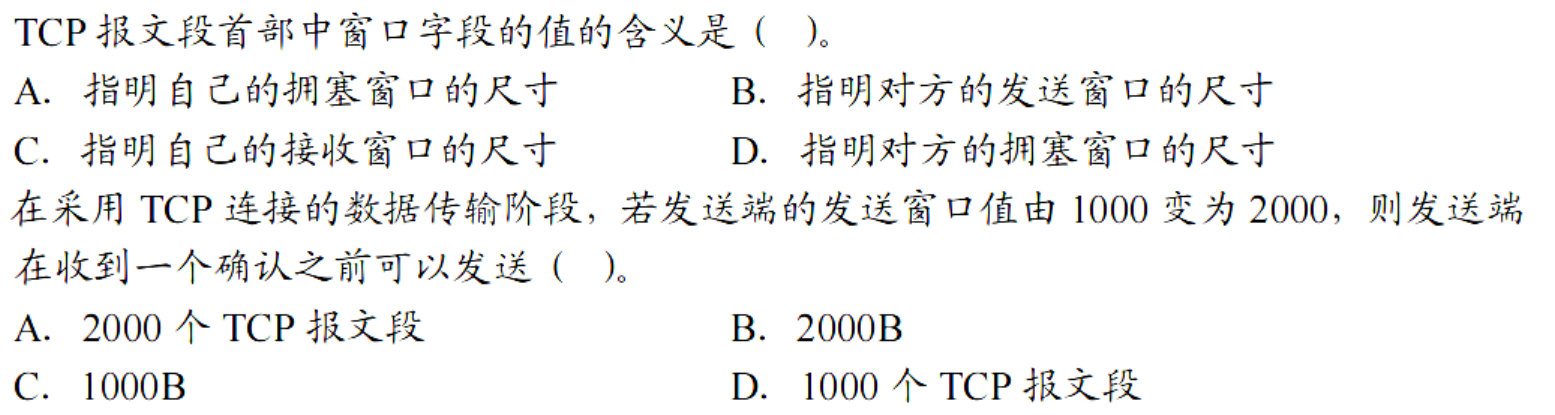 C,B 回忆一下 TCP 报文段首部中窗口字段的含义,代表的是接受窗口的尺寸,单位是字节