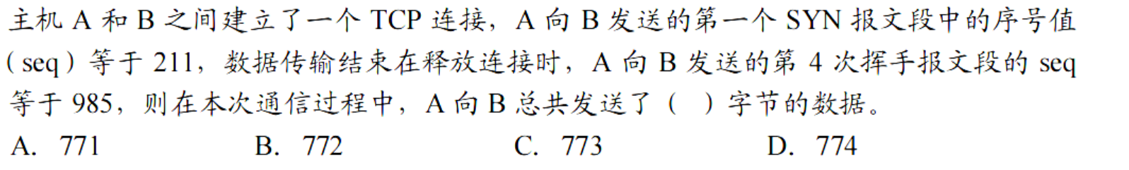 B 挥手时发送的第四次报文段的 seq = 985,说明挥手时的第一个报文段的 seq = 984,那么接受到的最后一个字节序号就是 983。第一个 SYN 段虽然部携带数据,但是消耗一个序号211,所以发送的字节是 212-983,共 772 个字节