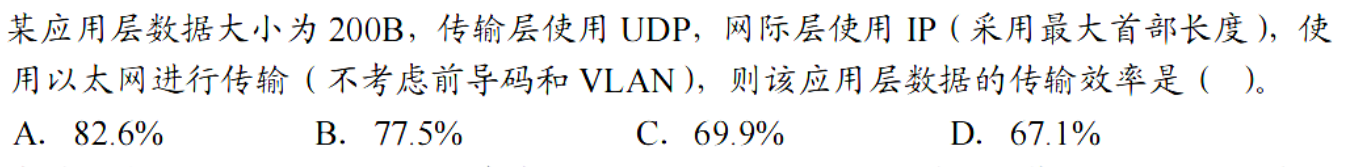 C 回忆一下数据链路层,以太网 MAC 帧的帧头(6+6+2)和帧尾(4)共 18 字节。IP 数据报首部 20-60字节,UDP 首部 8 字节, TCP 的首部则是 20-60 字节