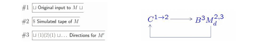 在这里 \(C^{1→2}\) 负责将第一带的内容复制到第二带并清空第二带;\(B^3\) 生成第三带上字典序的下一个指令序列;\(M_d^{2,3}\) 是 \(M\) 的确定性版本,在第二和第三带上运行。