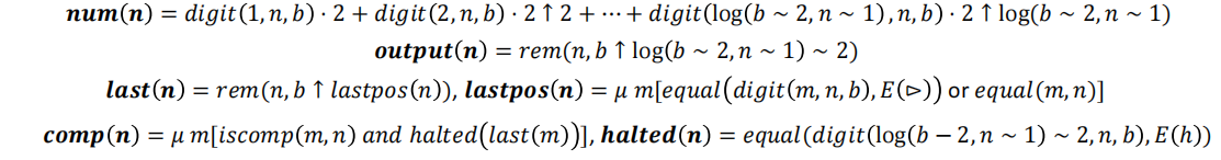 - \(\text{comp}(n)\) 表示一个整数,其在 \(b\) 进制下的表示是机器从初始配置 \(\triangleright\sqcup sw\)(\(w\) 为 \(n\) 的二进制编码)开始,经过一系列合法状态转移后,最终停机于\(\triangleright\sqcup hw'\)(\(w'\) 为 \(f(n)\) 的二进制编码)的完整计算历史(即所有中间配置的拼接);