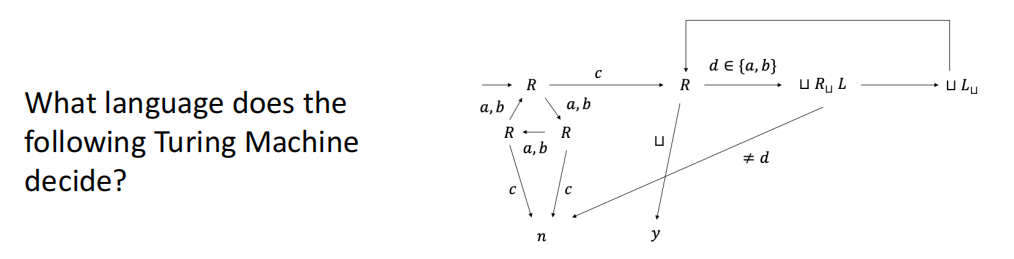 判定:令\(M=(K,\Sigma,\Delta,s,\{y,n\})\),输入符号集 \(\Sigma_0\),\(M\) decides a language \(L\subseteq\Sigma_0^*\) if