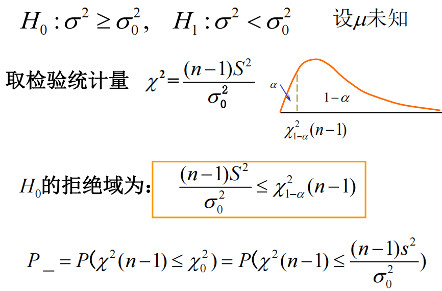 则 \(P_- = 2 \min \left\{ P[\chi^2(n-1) \leq \chi_0^2], P[\chi^2(n-1) \geq \chi_0^2] \right\}\)