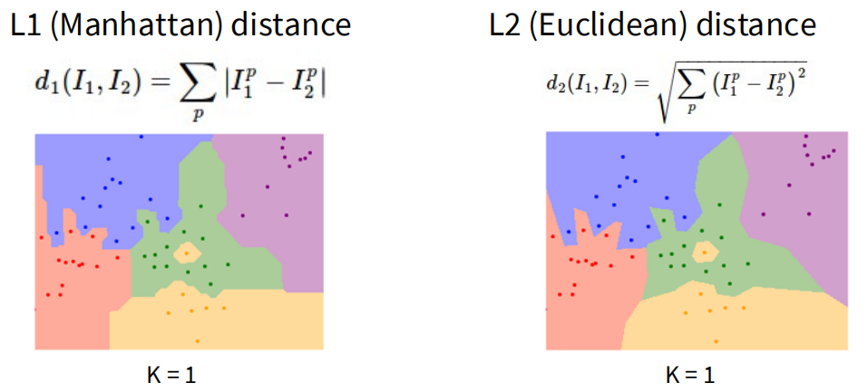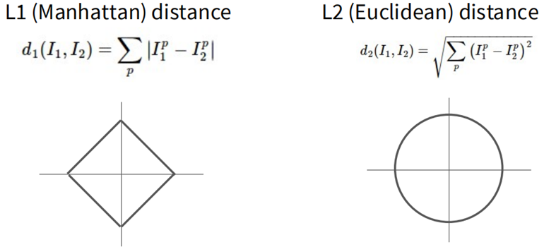 关于距离的定义,有L1 (曼哈顿距离) 和 L2 (欧拉距离) 两种