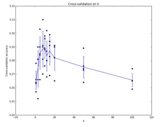 第一种方法显然是不可取的,因为 K=1 永远在训练集中表现最优。第二种方法也是不可取的,因为我们并不知道其对新的数据的表现,只是建立在测试集上。所以一般采用第三种方法来调参。