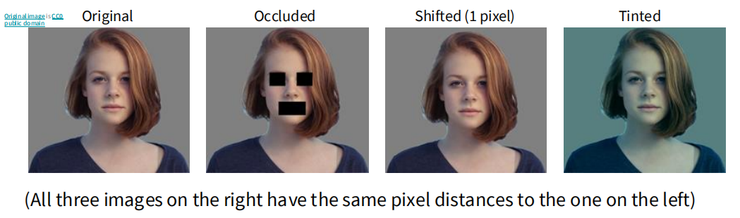 比如说右边三幅图和左边的原图的欧氏距离是相同的,但是很明显这三张图片有着很大的区别
