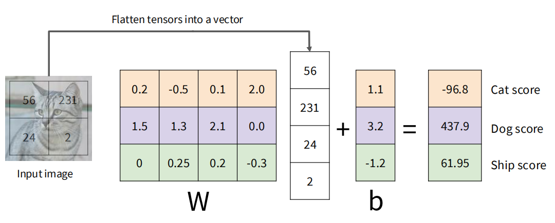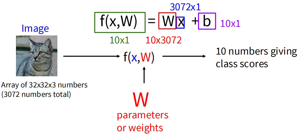 10 numbers giving class scores:函数f(x, W)的输出是10个数字,每个数字对应一个可能的类别(例如,在CIFAR-10数据集中,有10个类别)。这些数字表示输入图像属于各个类别的得分或概率。