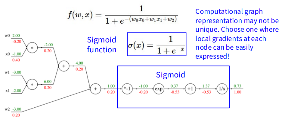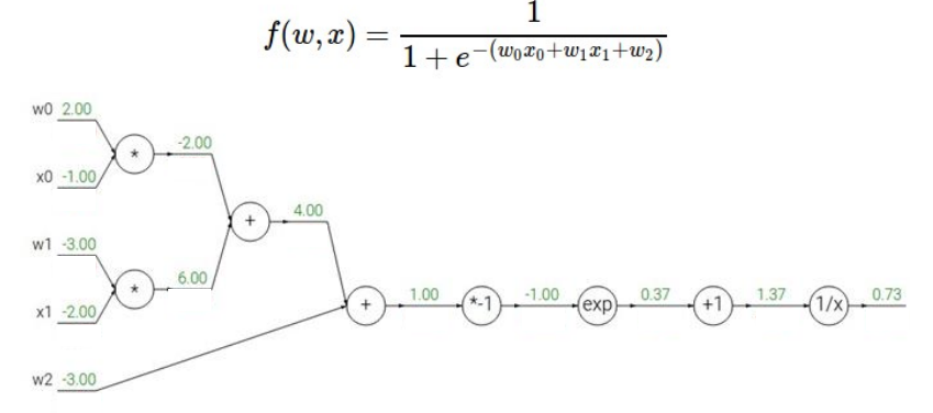 关于 Backpropagation,这块内容比较简单,就是利用计算图和链式法则,快速地求出函数对于每个变量的偏导,下面讲解一个例子,首先我们向前传播,将每个部分得到的值算出来