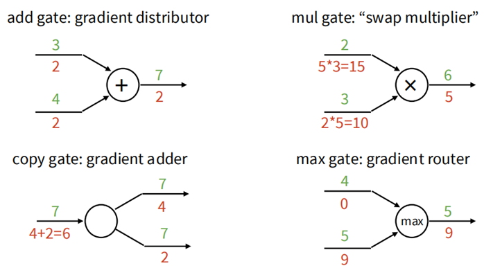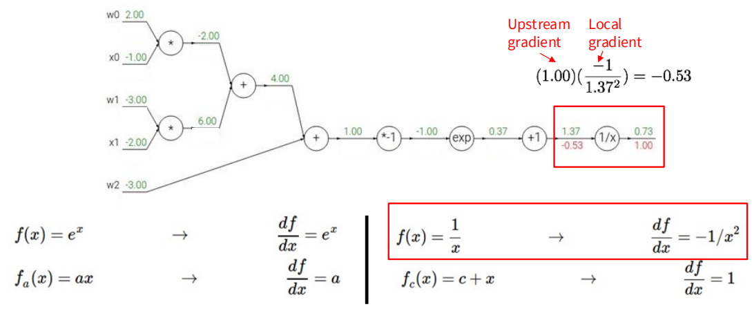 然后我们逐步往前求每个部分关于 f 的梯度,每一次 backpropagation,先求出上游的梯度,然后乘上本地梯度,就可以得到相应部分的梯度。
